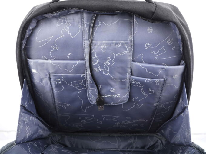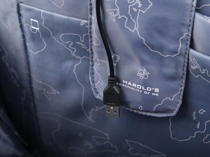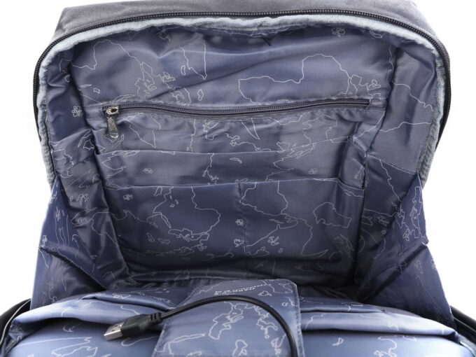 - Wewnątrz plecaka znajduje się kabel USB który po podłączeniu do powerbanka pozwoli na ładowanie telefonu komórkowego lub innego urządzenia za pomocą portu USB znajdującego się na zewnątrz (z boku plecaka). Pozwala to na wygodne ładowanie i korzystanie z urządzenia w tym samym czasie,