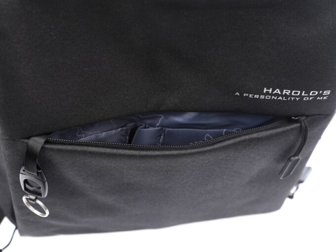- Z przodu plecaka znajduje się kieszonka zapinana na zamek błyskawiczny, wewnątrz przegródki na długopisy, notatki, oraz breloczek na klucze,