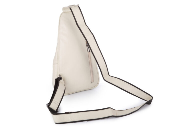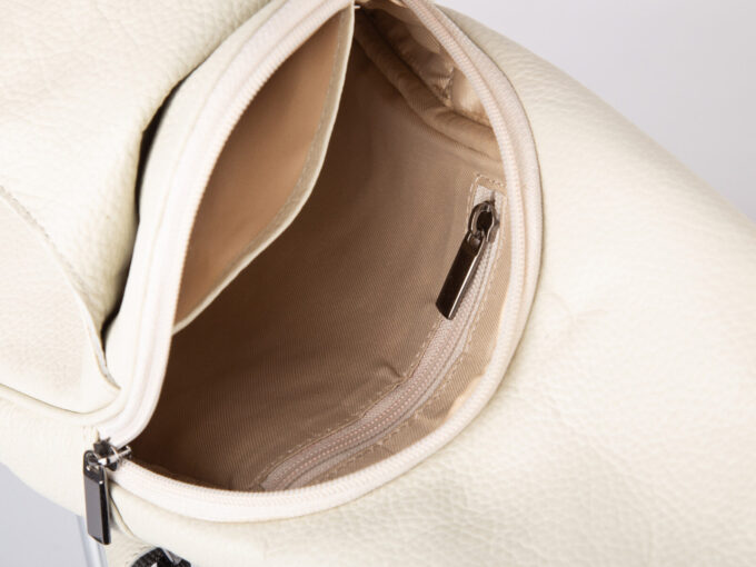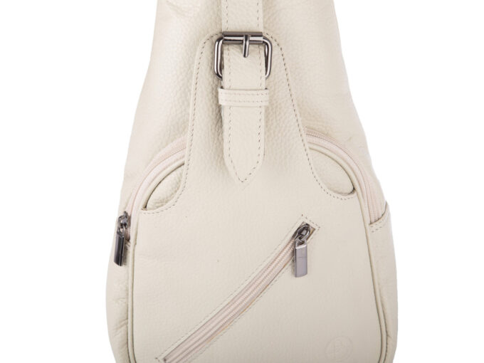 - Elegancki i starannie wykonany, skórzany, plecak damski na jedno ramię w kolorze jasnobeżowym.