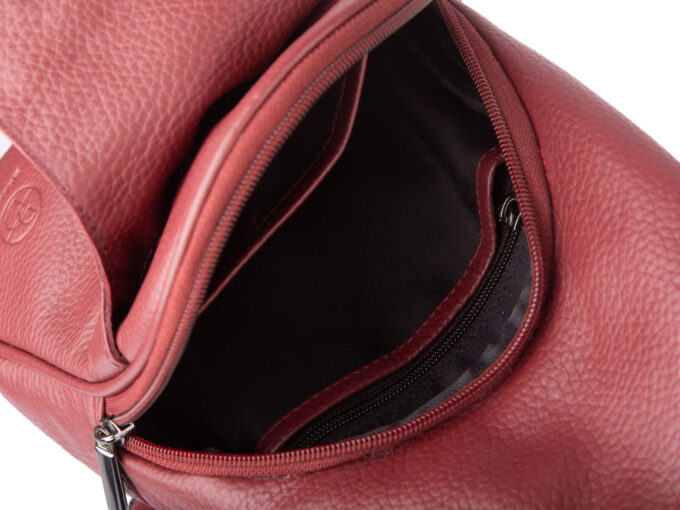 - Elegancki i starannie wykonany, skórzany, plecak damski na jedno ramię w ciemnym kolorze czerwonym, bordowym.