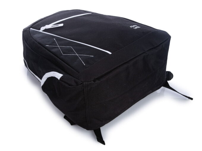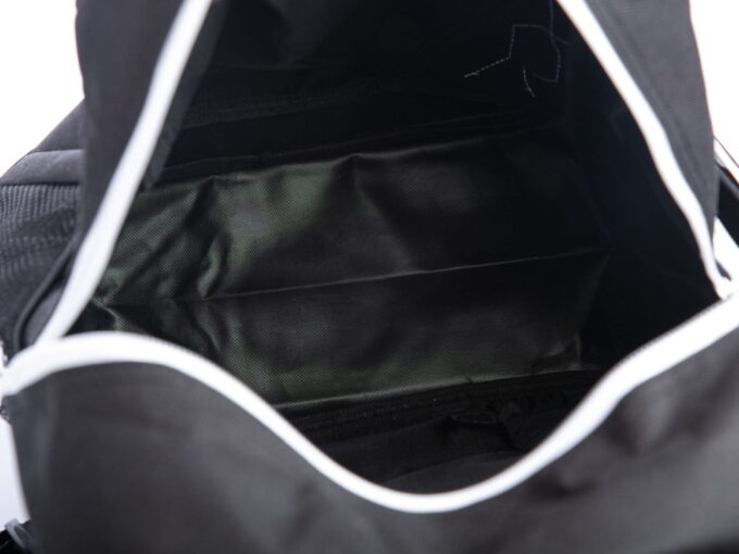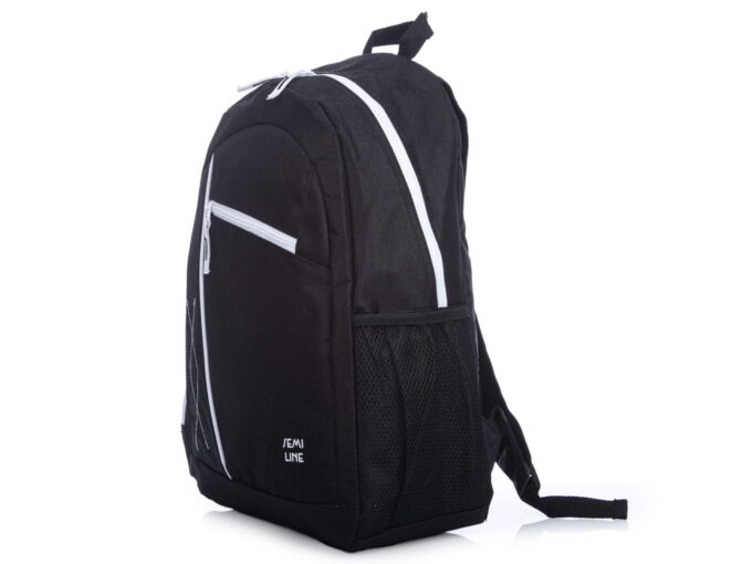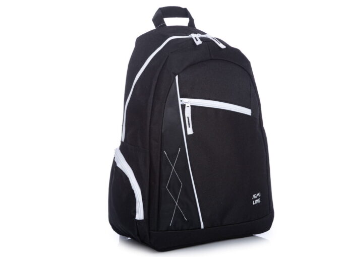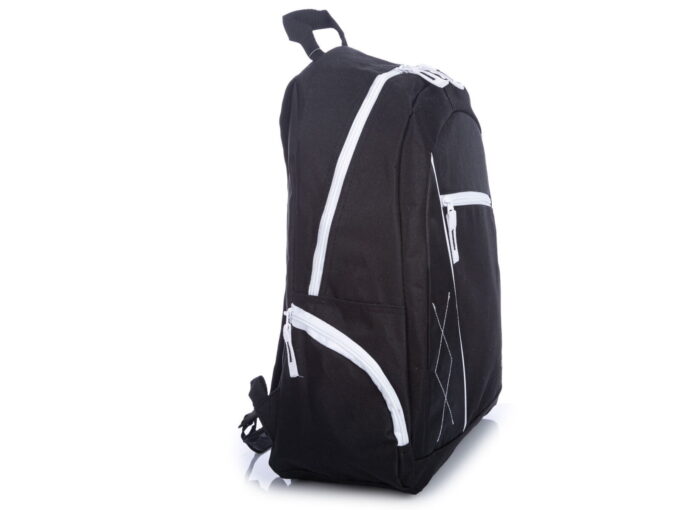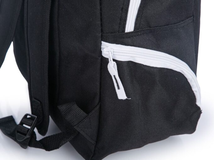 - Średniej wielkości plecak w kolorze czarnym z białymi wstawkami.