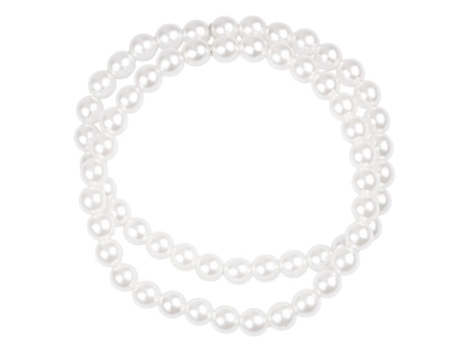 Elegancka podwójna bransoletka damska z pereł Preciosa w kolorze klasycznej bieli. Składa się z dwóch rzędów gładkich, błyszczących pereł szklanych Preciosa o delikatnym połysku, nawleczonych na dwie elastyczne gumki z metalowym łącznikiem. Dzięki temu biżuteria doskonale dopasowuje się do nadgarstka i jest bardzo wygodna w noszeniu.