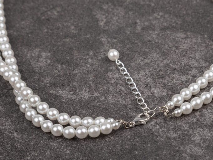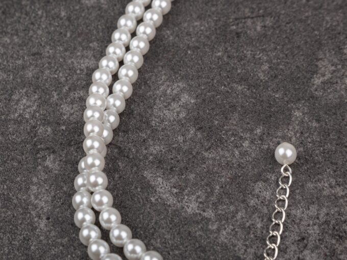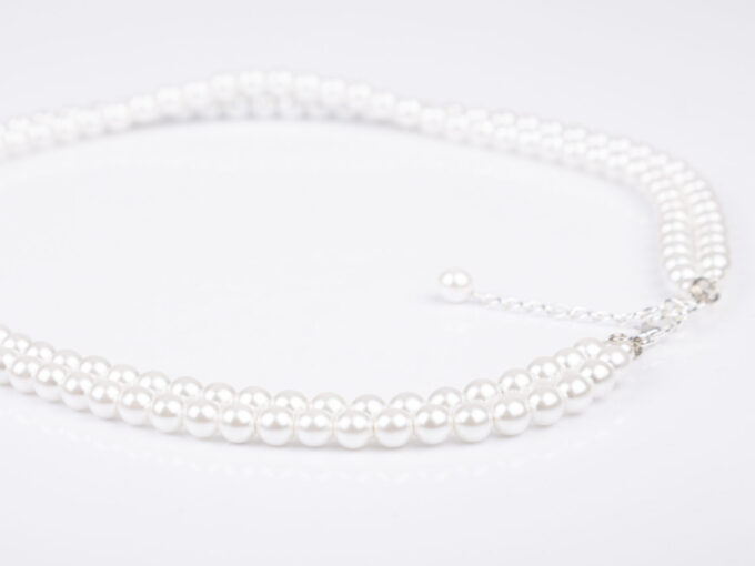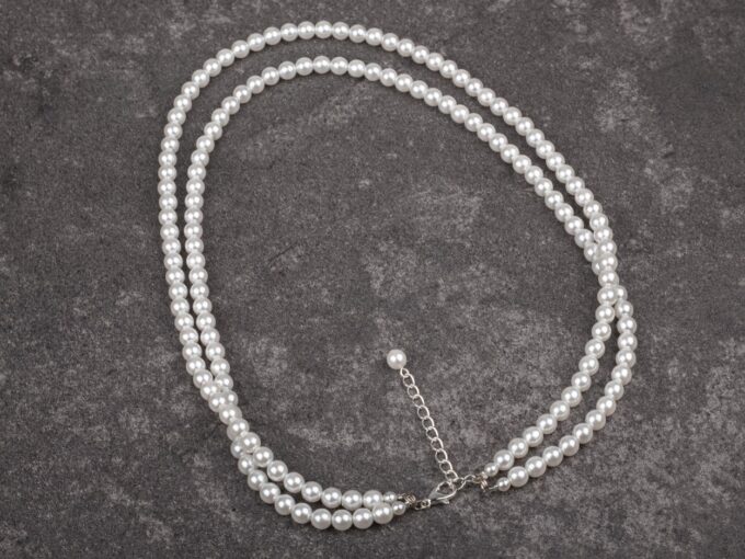 Delikatny, podwójny naszyjnik z białych pereł Preciosa (6 mm) o kaskadowym układzie, regulowanej długości 49 cm + 4 cm, ręcznie wykonany w Polsce i pozbawiony niklu — elegancki dodatek idealny do codziennych i wieczorowych stylizacji oraz jako biżuteria ślubna. Pełna specyfikacja ⬇