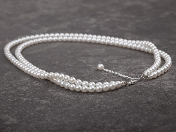 Wyjątkowy, podwójny naszyjnik damski z białych szklanych pereł Preciosa. Subtelny i elegancki. Dzięki połączeniu dwóch sznurów pereł całość zyskuje nutę oryginalności i delikatnego przepychu, zachowując przy tym lekkość i harmonię. Kaskadowe ułożenie pereł pięknie układa się na szyi, podkreślając dekolt i dodając stylizacji wyjątkowego charakteru. Naszyjnik został wykonany na wytrzymałych niciach, co gwarantuje trwałość i komfort noszenia. To doskonały dodatek zarówno do klasycznych sukienek, jak i nowoczesnych stylizacji z nutą retro.