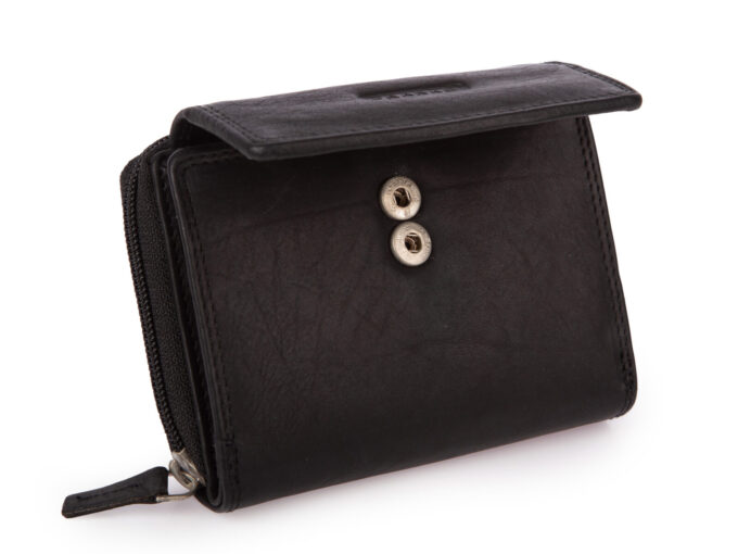 - Zapinany na półokrągłą patkę z mocnym metalowym zatrzaskiem z dwustopniową możliwością regulacji. Portfel można zapiąć ciasno lub szerzej, jeśli jest bardziej zapakowany.
