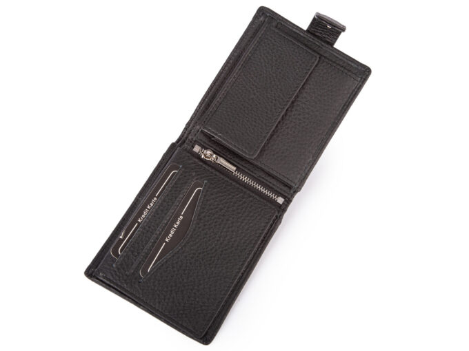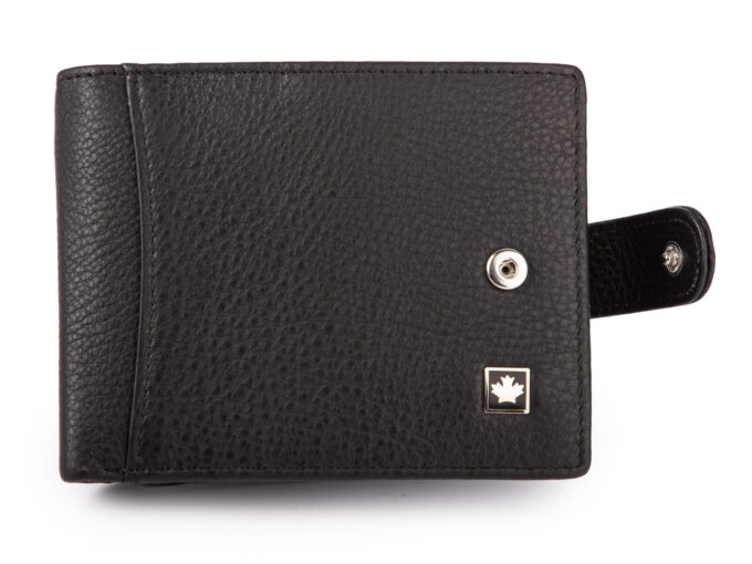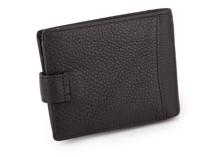 - Pojemny, czarny portfel męski skórzany zapinany na zatrzask.