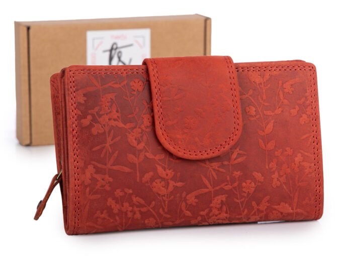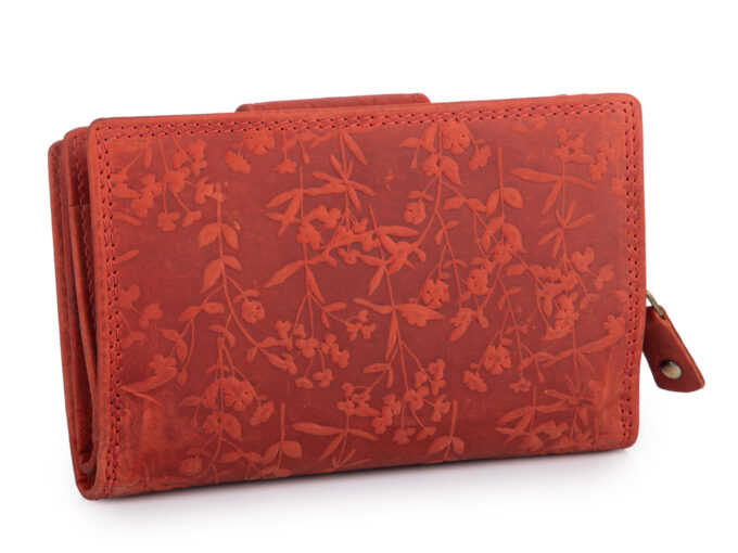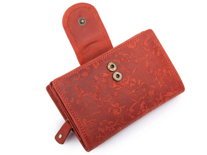 - Pojemny, skórzany portfel damski w kolorze czerwonym z tłoczonym, oryginalnym kwiatowym wzorem w stylu vintage.
