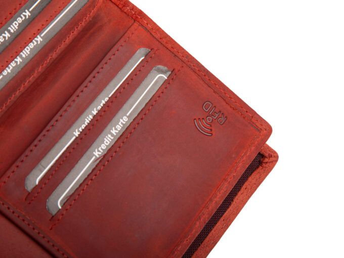 - Portfel posiada ochronę RFID która chroni znajdujące się w środku karty zbliżeniowe.