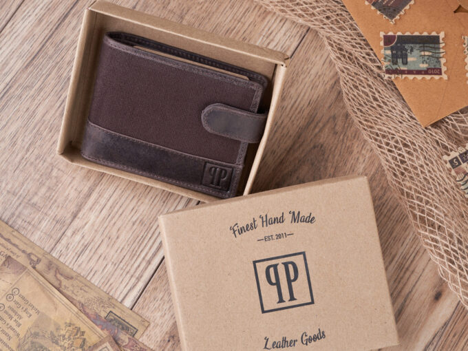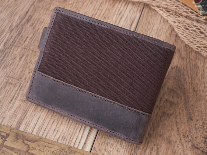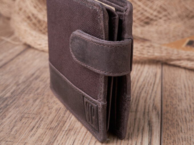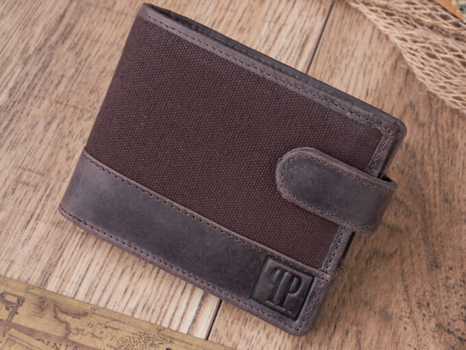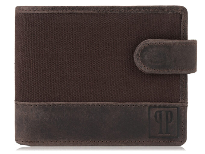 Poręczny, ciemnobrązowy portfel męski ze skóry naturalnej i mocnego canvasu Paolo Peruzzi