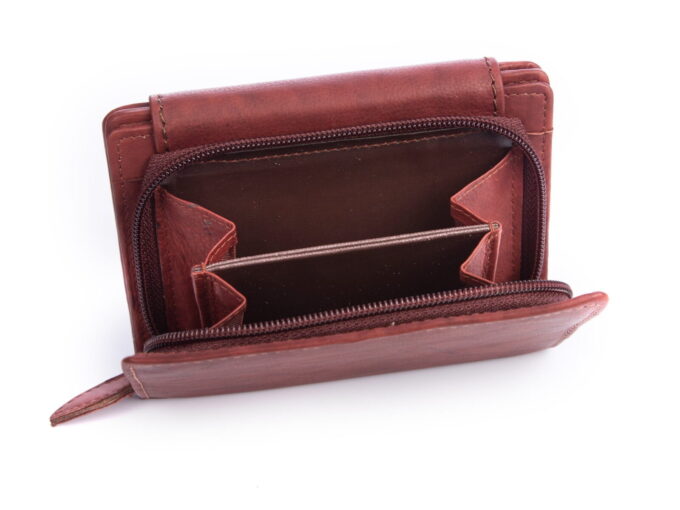 - Ciemnobrązowy portfel damski wykonany z miękkiej skóry naturalnej.