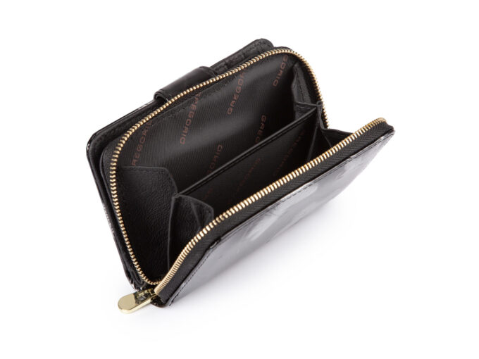 - Z zewnątrz portfel pokryty jest lśniącym lakierem, wewnątrz matowy