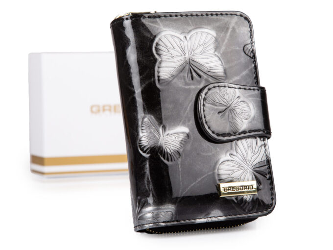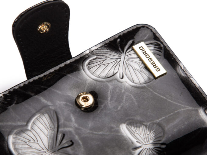 - Czarny, lakierowany portfel damski z modnym wzorem w motylki, polskiej marki GREGORIO.