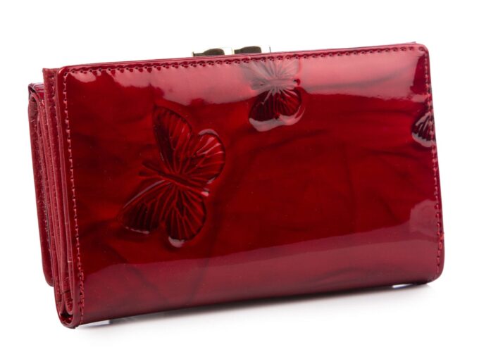 - Lakierowany, czerwony portfel damski z wzorkiem w wytłoczone motylki.