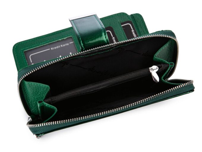 - Duży, poziomy portfel damski w kolorze zielonym (w odcieniu metalicznej butelkowej zieleni).