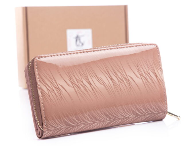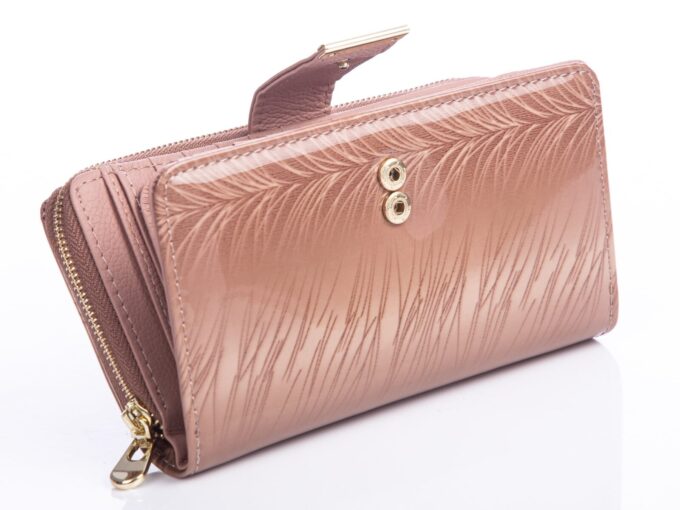 - Duży beżowy (kremowy) portfel damski z eleganckim cieniowanym wzorkiem przypominającym piórka.