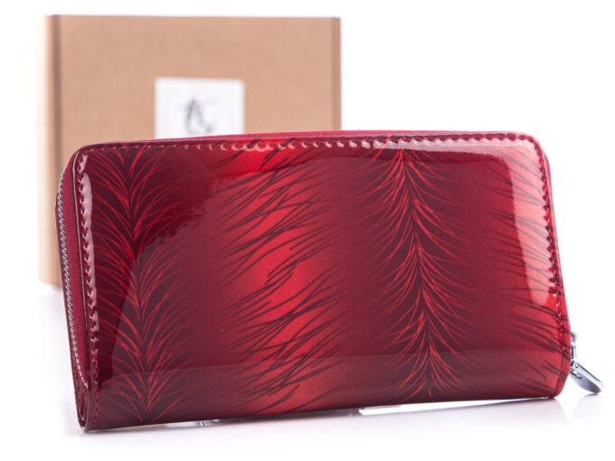 - Duży krwisto-czerwony portfel damski z eleganckim cieniowanym wzorkiem przypominającym piórka.
