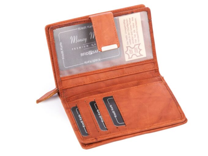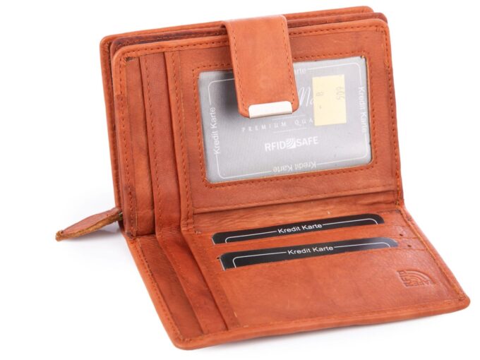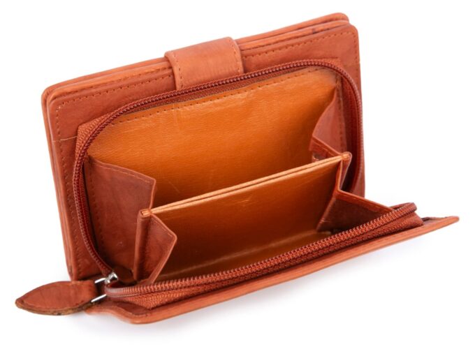 - Koniakowo-brązowy portfel damski wykonany z miękkiej skóry naturalnej.