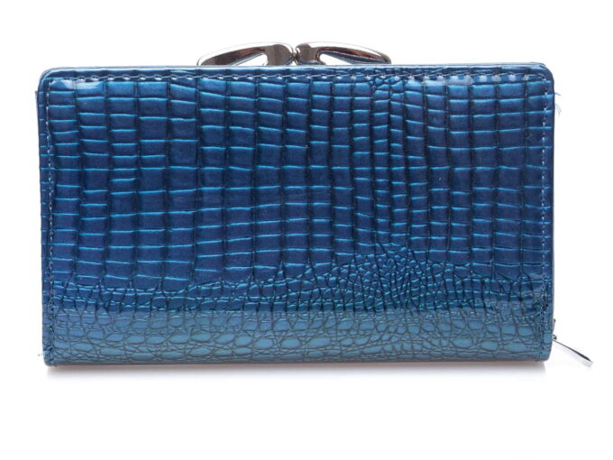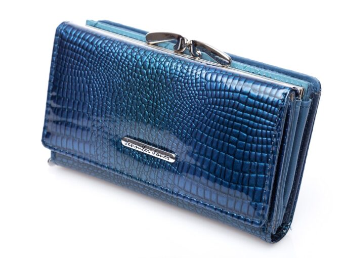 Pojemny portfel damski, lakierowany w kolorze niebieskim z dwoma kieszeniami na monety. Pełna specyfikacja ⬇
