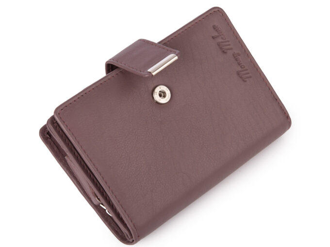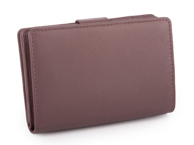 - Średni portfel damski wykonany z miękkiej skóry naturalnej w oryginalnym kolorze mauve będącym połączeniem fioletu i brązu.