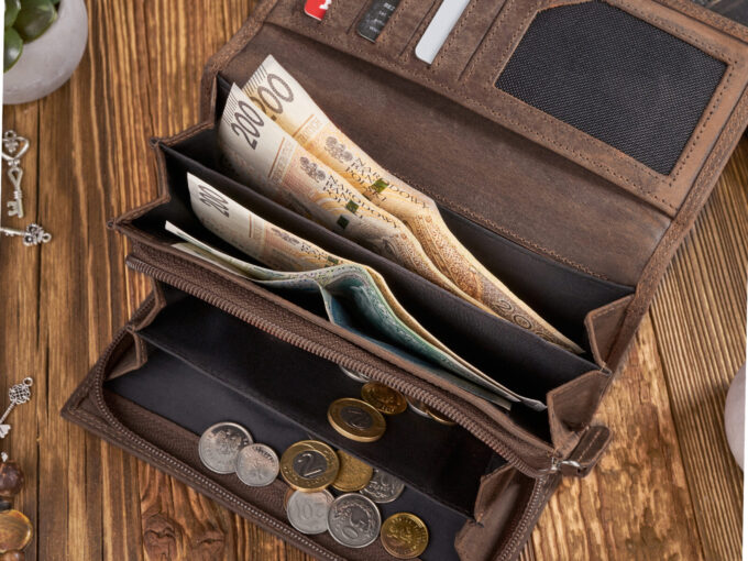 - Pojemna, podzielona na dwie części, kieszeń na monety zapinana na zamek błyskawiczny, wewnątrz portfela.