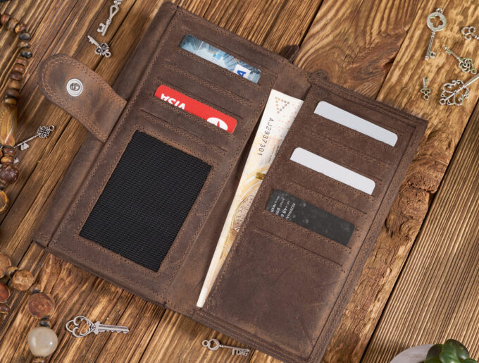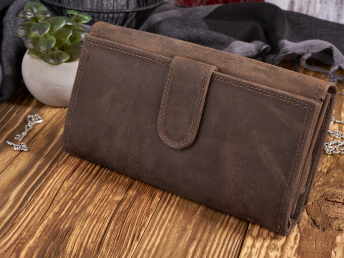 - Duży, poziomy portfel damski skórzany w stylu vintage w kolorze ciemnobrązowym.