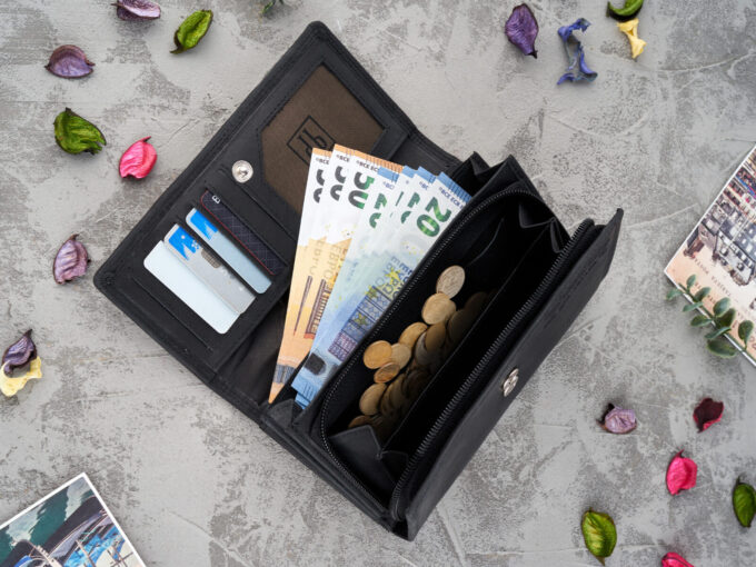 - Pojemna, podzielona na dwie części, kieszeń na monety zapinana na zamek błyskawiczny, wewnątrz portfela.