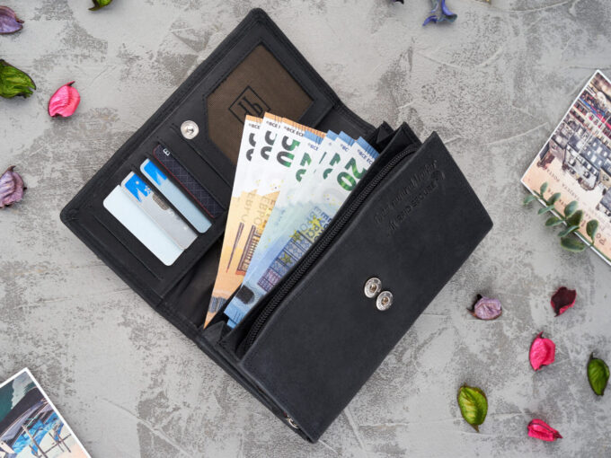 - Duży, poziomy portfel damski skórzany w stylu vintage w kolorze czarnym.