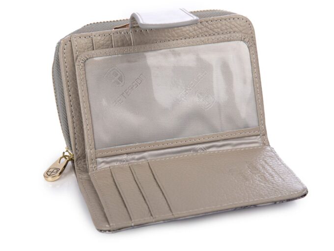 - Portfel z ochroną zbliżeniowych kart RFID. Zabezpieczenie blokuje dostęp do kart zbliżeniowych umieszczonych wewnątrz portfela.