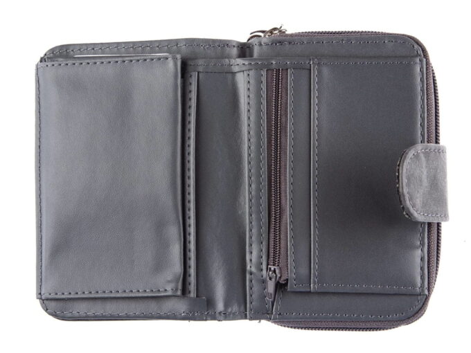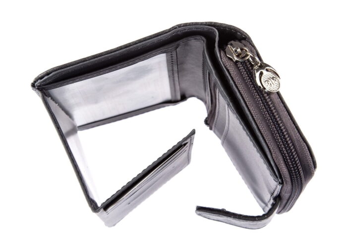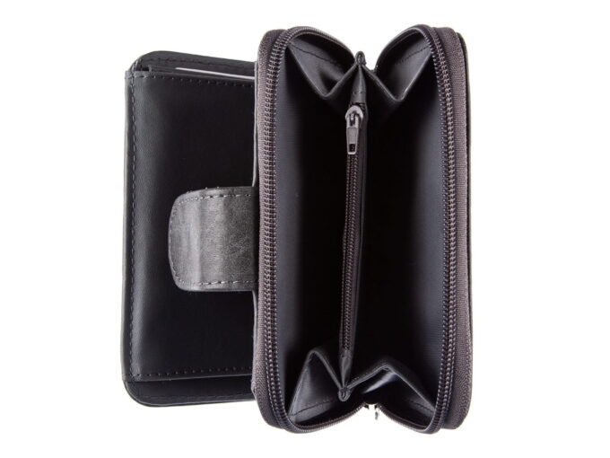 - Dodatkowa kieszonka zapinana na zamek błyskawiczny wewnątrz portfela – np. na monety lub karty rabatowe,