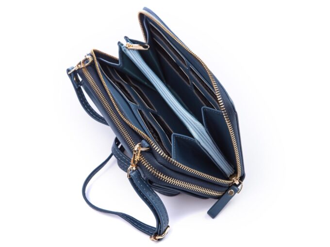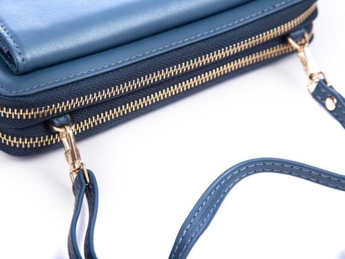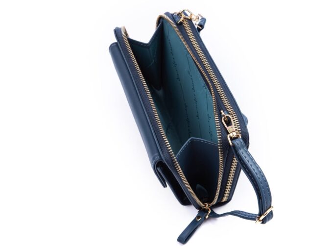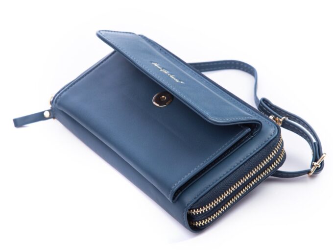 - Ciemnoniebieski, duży portfel damski / mini torebka z miejscem na telefon komórkowy, dokumenty i pieniądze.