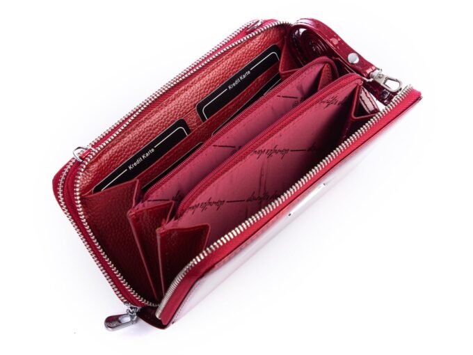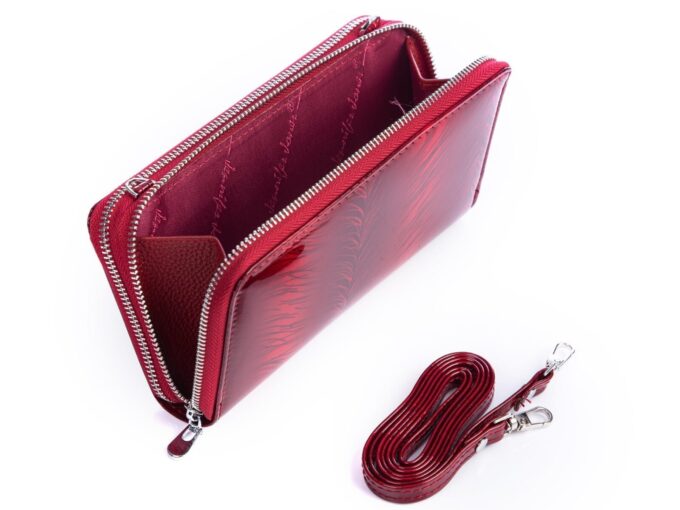 - Lakierowany portfel damski z długim paskiem na ramię pozwalającym na noszenie go w formie kopertówki, małej torebki.