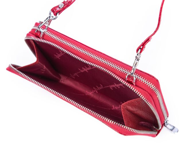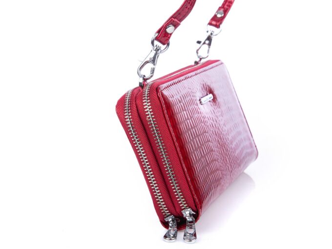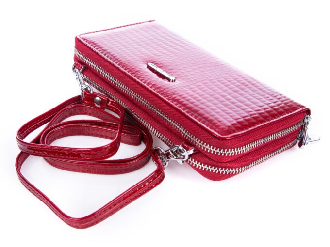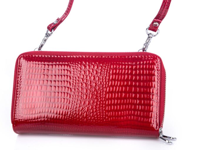 - Lakierowany portfel damski z długim paskiem na ramię pozwalającym na noszenie go w formie kopertówki, małej torebki.