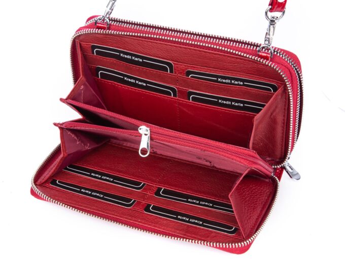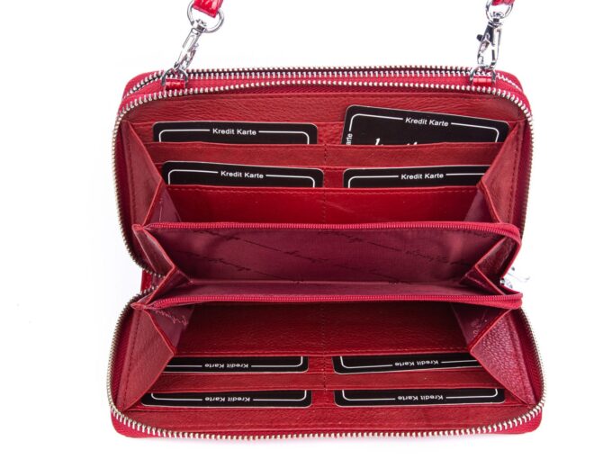 Czerwony portfel damski to idealny wybór dla Pań, które lubią mieć przy sobie wszystkie dokumenty i karty płatnicze. Model jest wyposażony w aż dwie pojemne komory zapinane na zamek błyskawiczny. W jednej z komór bez trudu zmieści się nawet telefon komórkowy. Z kolei w drugiej znajduje się miejsce na banknoty, schowek oraz kieszonki na karty płatnicze. Łącznie skórzany portfel jest wyposażony w 12 przegródek przeznaczonych na karty. Dodatkowo wewnątrz znajdziesz dwie przegrody na banknoty, zapinaną kieszeń na bilon oraz dwa funkcjonalne schowki.