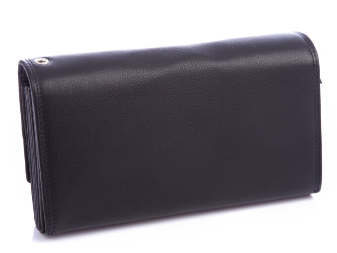- Na grzbiecie, portfel posiada metalowe „oczko” do przymocowania paska lub łańcuszka.