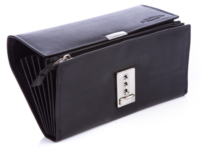 - Portfel zapinany jest na metalowy zatrzask z trzema poziomami regulacji.