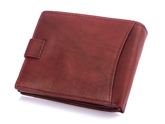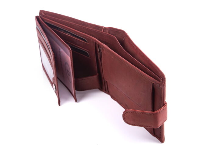 - Kieszeń na monety zamykana jest na patkę z metalowym zatrzaskiem, wewnątrz portfela.