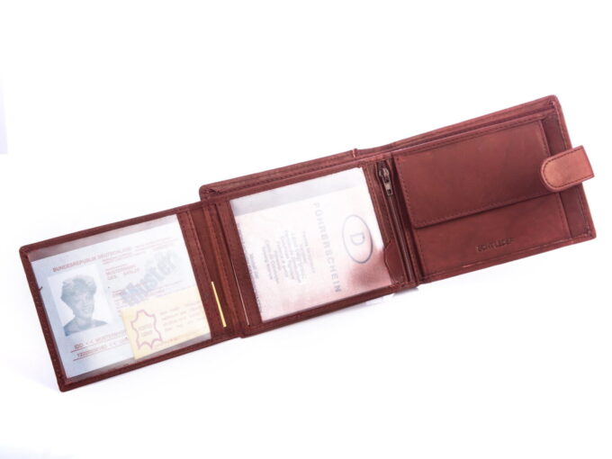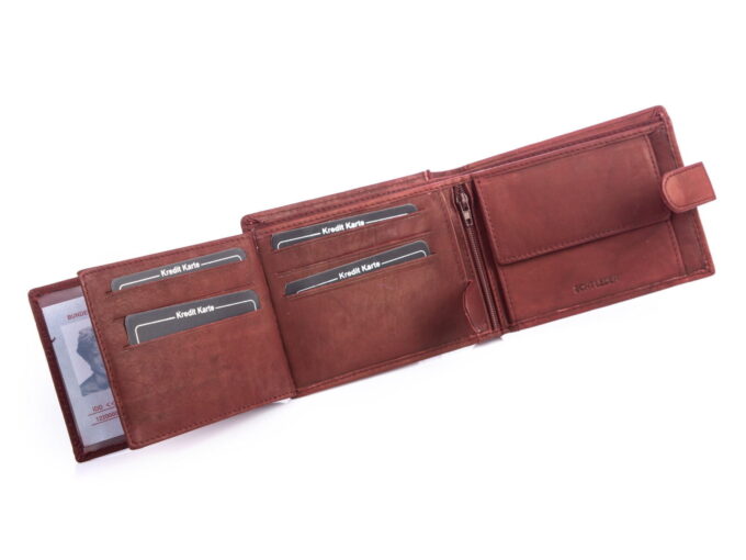 - Portfel posiada miejsce na banknoty, karty, dokumenty, zdjęcia i monety.