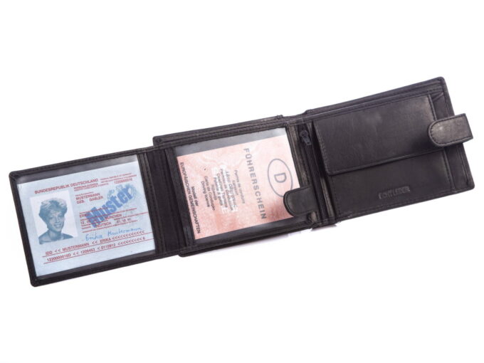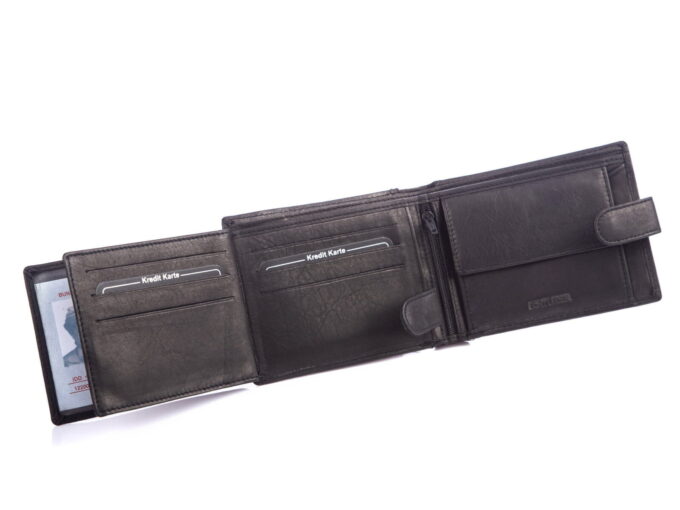 - Portfel posiada miejsce na banknoty, karty, dokumenty, zdjęcia i monety.