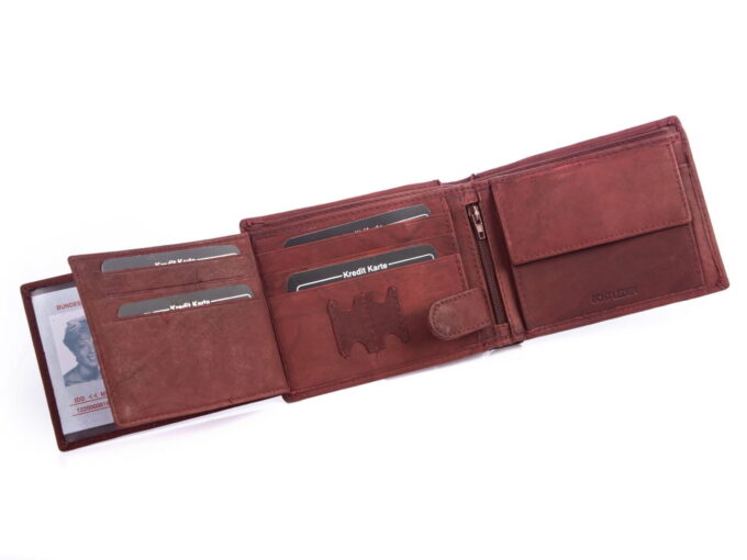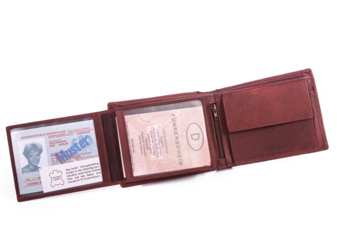 - Portfel posiada miejsce na banknoty, karty, dokumenty, zdjęcia i monety.