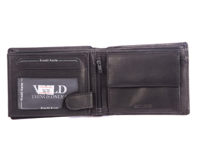 - Kieszeń na monety zamykana jest na patkę z metalowym zatrzaskiem, wewnątrz portfela.