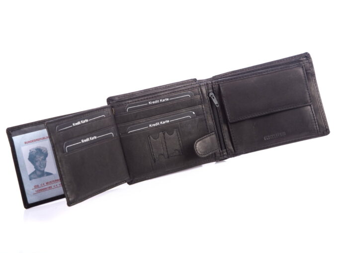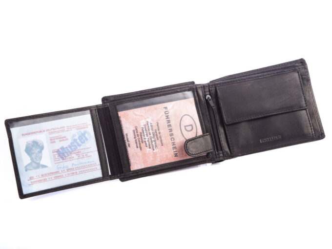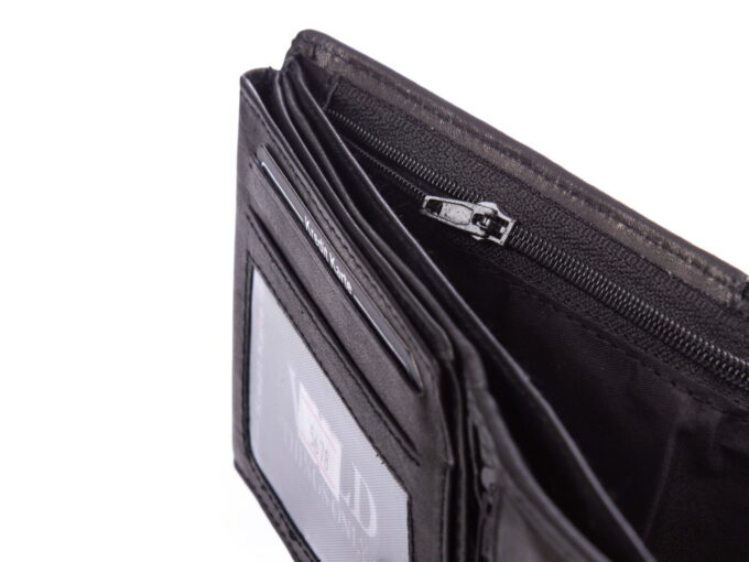 - Portfel posiada miejsce na banknoty, karty, dokumenty, zdjęcia i monety.