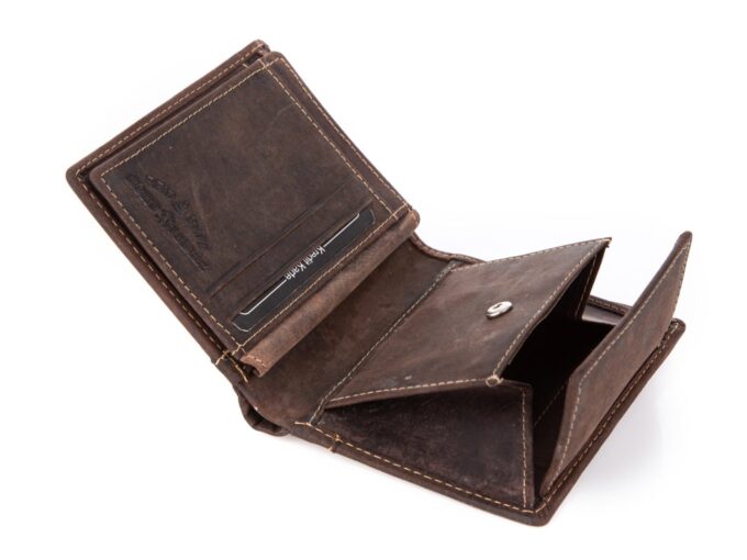 - Kieszeń na bilon umieszczona jest w środku portfela i zapinana jest na patkę z mocnym, metalowym zatrzaskiem.
