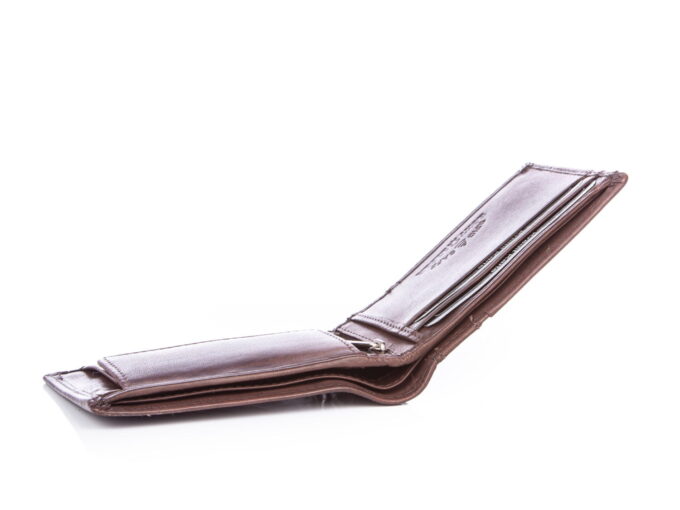 - Poręczny portfel męski typu bifold w kolorze ciemnobrązowym.