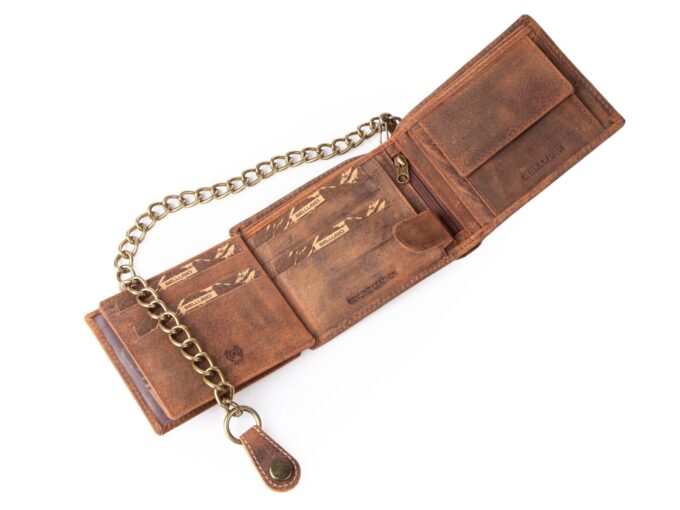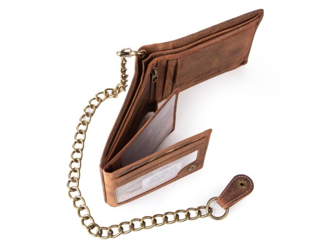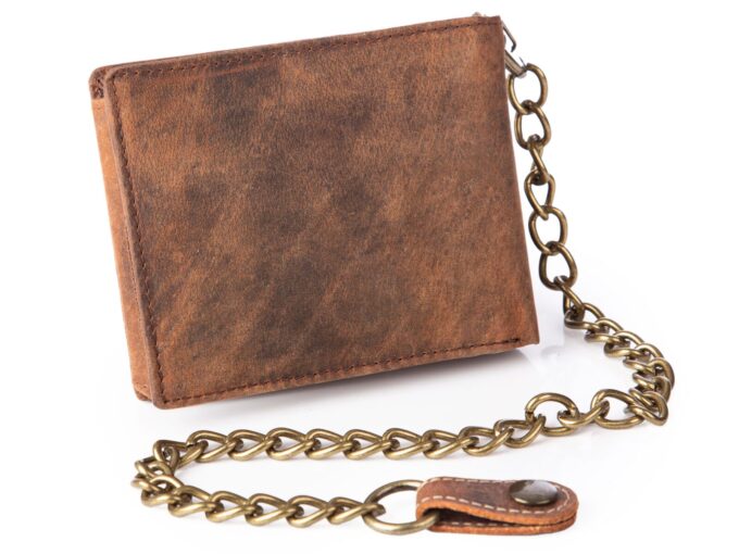 - Brązowy, męski portfel skórzany z grubym, metalowym łańcuchem.