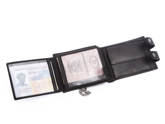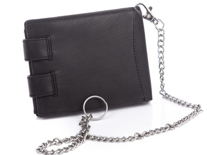 - Portfel z metalowym łańcuchem z karabińczykiem do przyczepienia do kluczy lub do spodni.