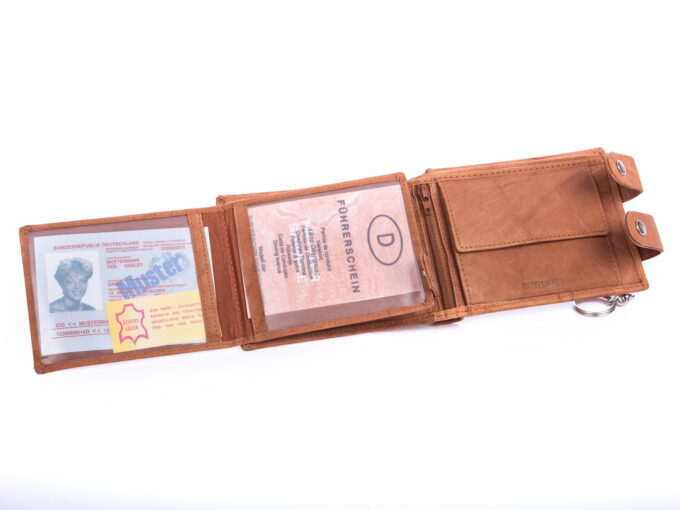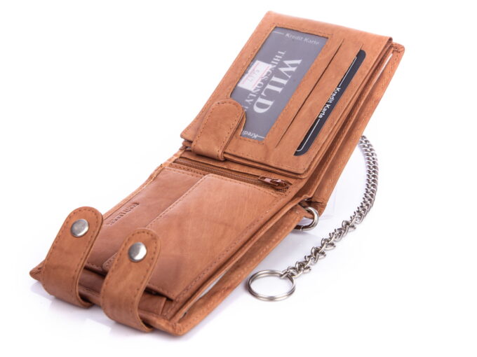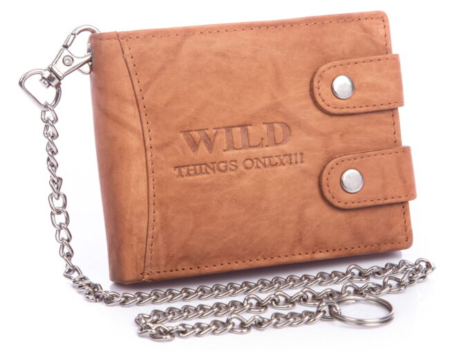 - Jasnobrązowy portfel męski z łańcuchem niemieckiej marki WILD Things Only.