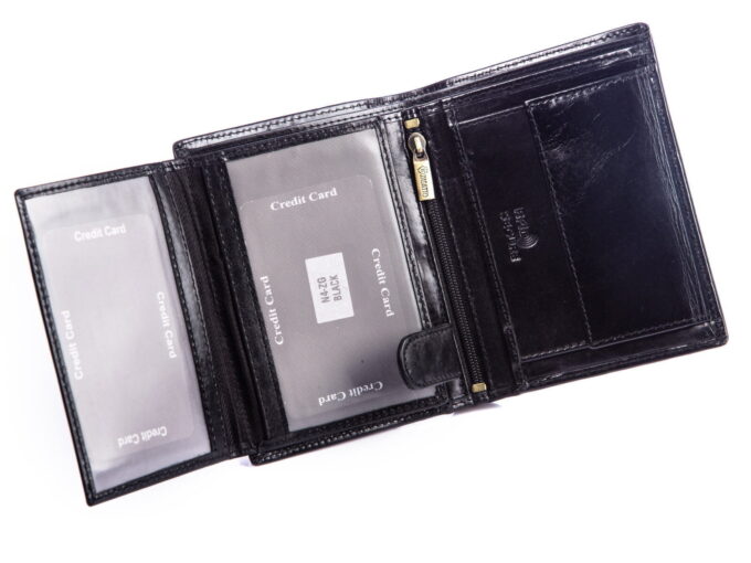 • Portfel z zabezpieczeniem zblizeniowych kart płatniczych RFID. Chroni znajdujące się wewnatrz portfela karty zblizeniowe przed dostępem z zewnątrz.