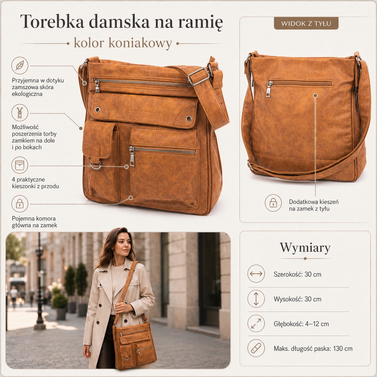 Koniakowo-beżowa, wygodna torebka damska z możliwością poszerzania. Wyposażona w dużo praktycznych kieszonek i schowków. Uszyta z wysokiej jakości skóry ekologicznej przypominającej zamsz. Pełna specyfikacja ⬇