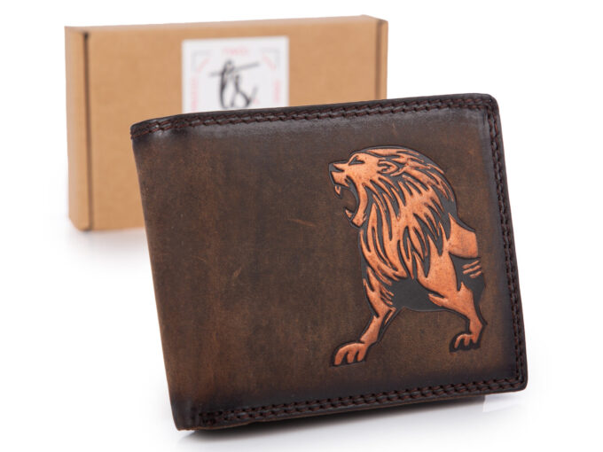 Poziomy, brązowy portfel męski z grubej skóry naturalnej vintage z lwem RFID