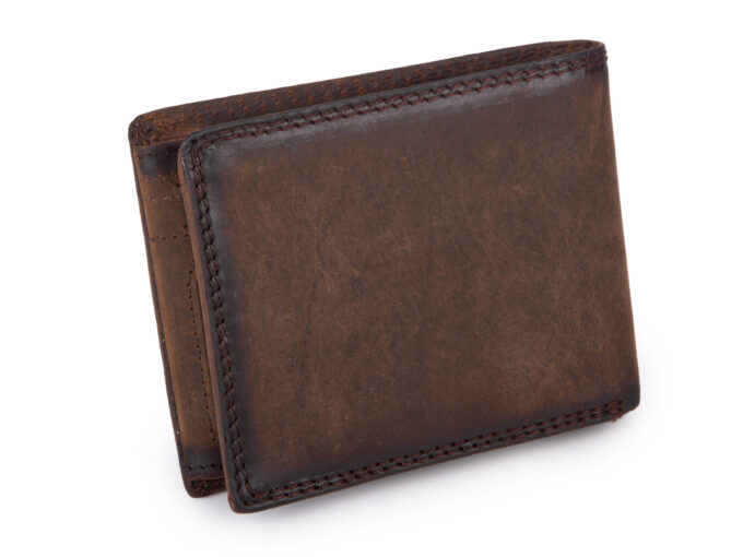 - Brązowy, klasyczny męski portfel skórzany w orientacji poziomej, wykonany z grubej skóry naturalnej typu vintage, stylizowanej na przecieraną (efekt postarzenia).